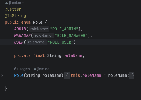 코드를 다시 살펴보면 조금 아쉬운 점이 있다. 중간에 Role이 추가 될때 마다 하드코딩으로 String 을 작성해 줘야 한다는 것이다. 그렇다면 개발자가 실수를 할 가능성이 굉장히 많아진다. 그래서 나는 enum의 상수 인덱스를 활용하기로 했다.