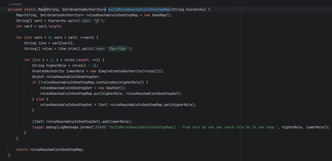 코드를 확대해서 살펴보면 우리가 작성한 String 을 가지고 split("\n") 줄바꿈을 기준으로 먼저 구분한다. 그 후 나누어진 String 을 split("\\s+>+\\s") 으로 Role들을 나누어 왼쪽에 있던 Role이 더 큰 권한을 가지게 해 주는 것이다. 이처럼 정규식이 메서드에 설정되어 있기에 잘 확인한 후 코드를 작서성해야한다.