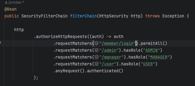 시큐리티 필터체인을 보면 admin page, manage page, user page 에 권한을 두었다. 여기서 우리가 원하는 것은 admin은 manage, user 페이지에 접근 할 수 있어야 하고 manager는 user 페이지에 접근 할 수 있어야 한다.